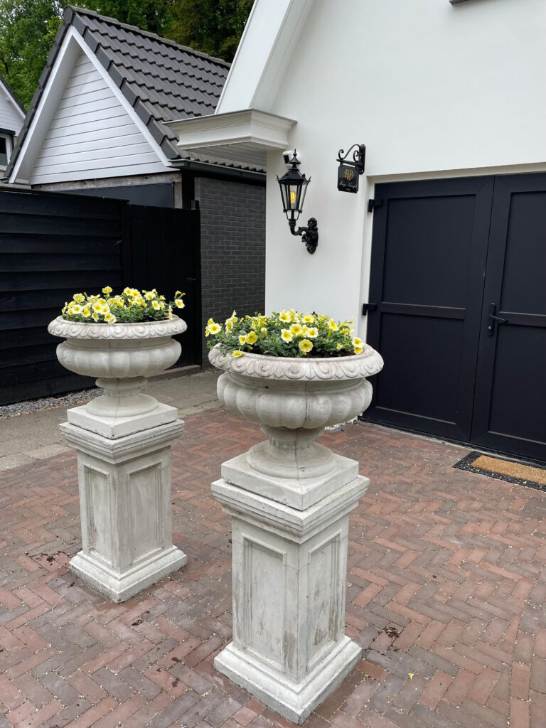De zuilen van 70 cm hoog en de vazen van 40 cm hoog, die deze entree prachtig versieren.